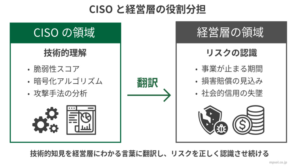 CISO(Chief Information Security Officer:情報セキュリティ最高責任者)の真の役割は、リスクを正しく「認識」させ続け、それを経営判断の土俵に乗せることなのです。