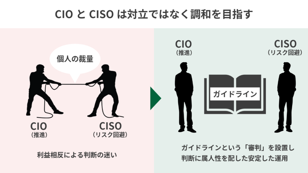 CIOとCISOの利益相反などの組織的な課題は、個人の能力に頼るのではなく、例えばFISC安全対策基準などを参考に、セキュリティガイドラインの策定やプロセスのシステム化によって解決を図るべきです。