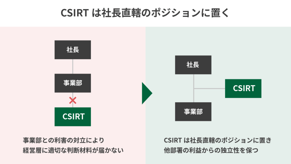 CSIRTは社長直轄のポジションに置くことが望ましいとされています。セキュリティ対策が他の部署の利益(売上など)と相反しやすいため、独立性を保つ必要があるからです 。