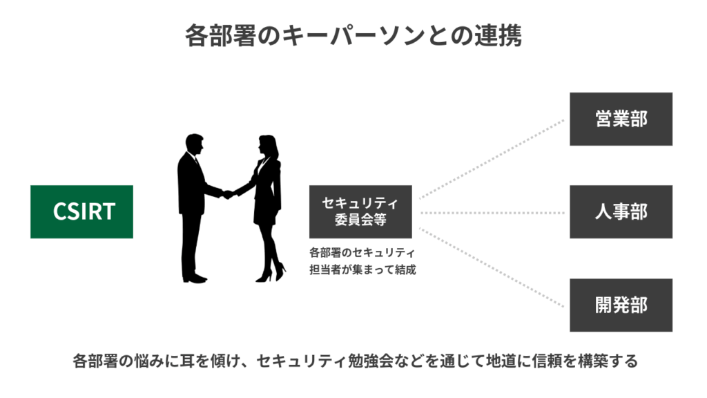 各部署にいるセキュリティに詳しい「キーパーソン」を見つけ、その人たちとの連携を確立することが、縦割りの組織を突破する鍵になります 。