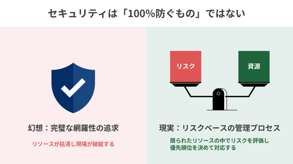 しかし、私の金融ITシステム開発の経験から言えるのは、セキュリティは「100%防ぐための魔法」ではないということです。情報セキュリティ対策の本質は、限られたリソースの中でリスク評価を行い優先順位を決め、社会的な責任を果たし続けるためのリスクベースの管理プロセスにほかなりません。