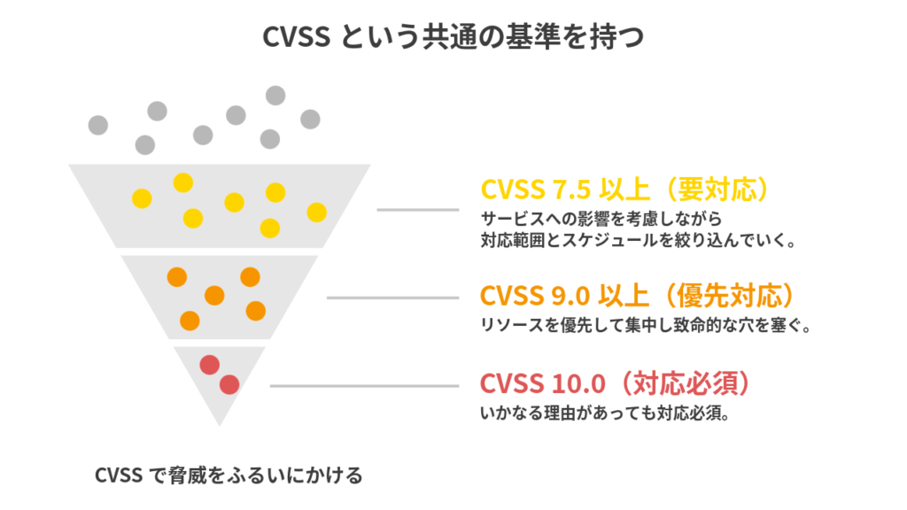 このCVSSという物差しを使えば、膨大な脆弱性リストを「対応すべきもの」と「許容すべきもの」に、論理的に分類できるわけです。