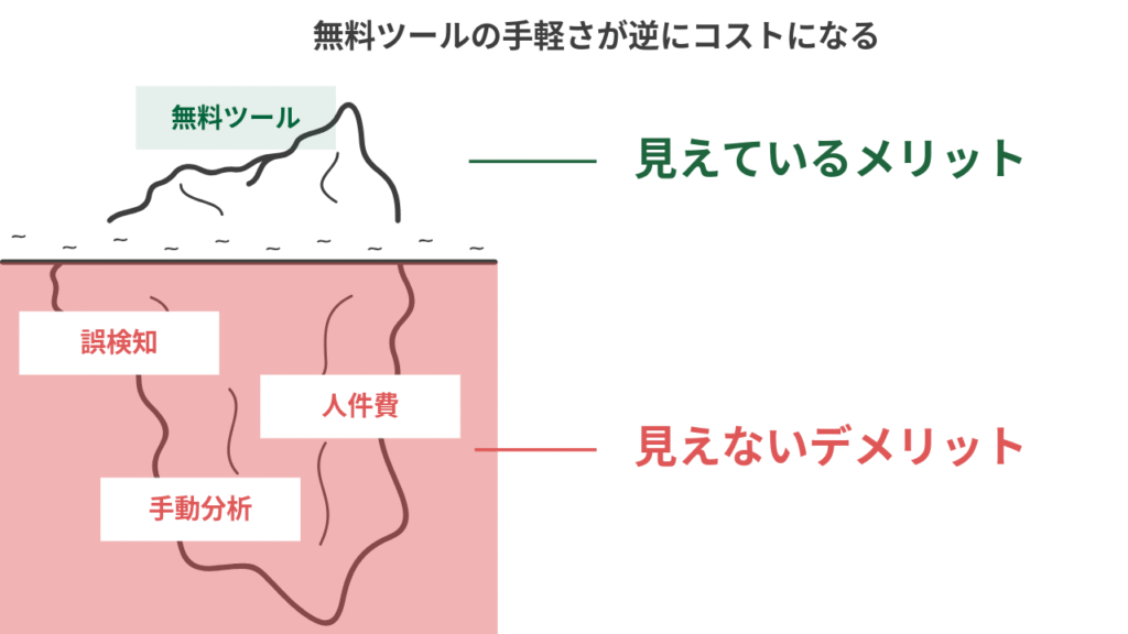 その一つひとつが本当にリスクなのかを、知識のない担当者が悩み、時間を溶かしていく。その工数を金額に換算すれば、最初からプロに依頼したり適切な有償ツールを導入したりするコストを優に超えてしまうわけです。