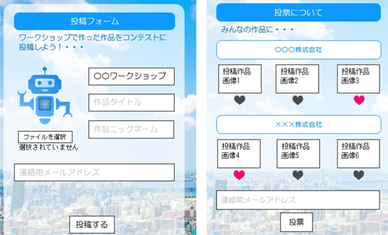 「投票ロボ」はユーザーが作品を投稿し、投稿された作品に他のユーザーが投票できるアプリで、投票をブロックチェーンに記録しております。実証実験では、ATCロボットストリートで実施されるワークショップ参加者に自分で作った作品を投稿してもらい、それを来場者に評価してもらうことで機能を検証します。