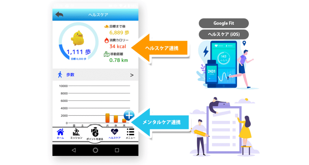 ヘルスケア、メンタルケア | GoogleFit、ヘルスケア(iOS)、外部ツール連携 | 日々の睡眠時間、歩数、消費カロリーなどを連携し管理することが可能です。外部ツール連携でメンタルケアに役立てることもできます。 |