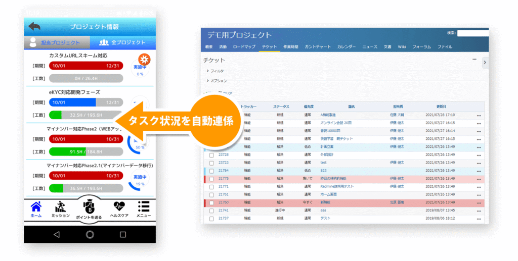 業務管理 | タスク管理ツール連携 | Redmineなどのタスク管理ツールと連携し自分やチームのタスク進捗を確認できます。 |