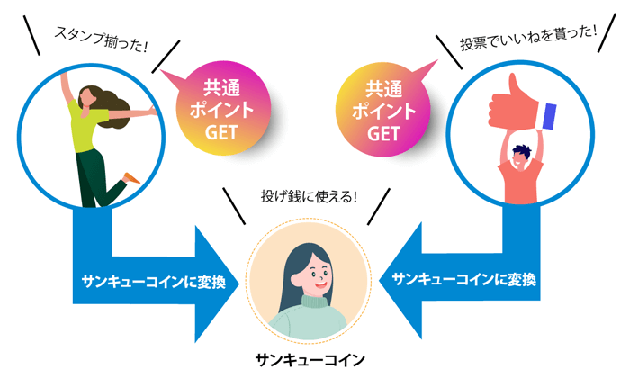 当社の持つ「サンキューコインアプリ」と連携し、投票やスタンプラリーで獲得した共通ポイントを社内サンキューコインに変換することが可能です。