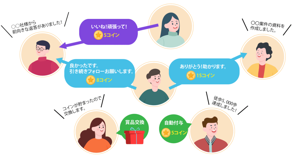 新規アポ獲得、各種資料作成、1日規定歩数以上を歩く(ヘルスケア)など、あらかじめ提示された目標(ミッション)を達成することによりコインが付与されます。