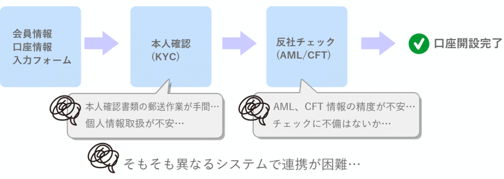 「本人確認書類の郵送作業に手間とコストがかかる」「個人情報の取り扱いに不安がある」「異なるシステム間の連携が難しく、作業が非効率だ」といった課題は、業務のボトルネックになりがちです。また、AML(アンチ・マネー・ロンダリング)やCFT(テロ資金供与対策)のチェック精度に不安を感じている企業も少なくありません。