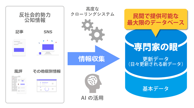 独自のクローリングシステム/AIを活用して反社会的勢力の情報を取得。更にノウハウある専門家がデータを日々更新。Web検索は勿論、API接続、バッチ処理などを用い、簡便に信用情報データベースとの連携が可能です。
