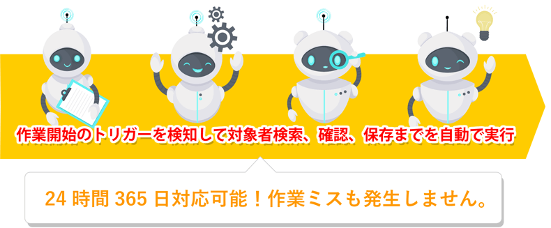 本人確認(KYC)反社チェック(AML/CFT )業務にRPAツールを導入した場合のイメージです。一度設定すればロボットが定期的に自動で作業を実行するので、人的ミス防止、工数削減および効率化に繋がります。